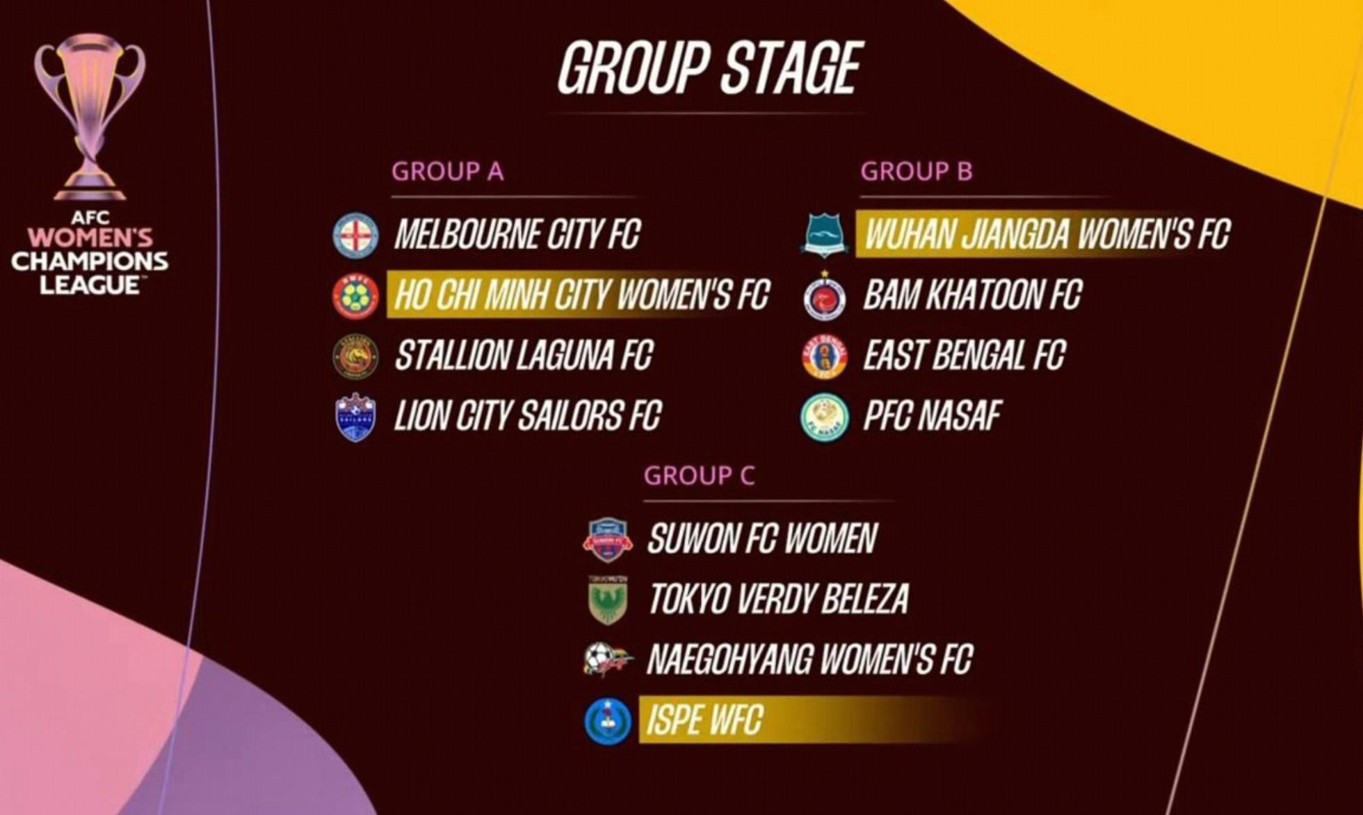 北京时间9月11日,女足亚冠精英赛的抽签结果出炉,武汉女足与巴姆卡通(伊朗)、东孟加拉(印度)、纳萨夫(乌兹别克斯坦)同组,C组水原(韩国)、日视东京绿茵美人(日本)、我故乡(朝鲜)同组。A组:墨尔本城(澳大利亚)、胡志明市(越南)、内湖公马(菲律宾)、狮城水手(新加坡)B组:武汉车谷江大...